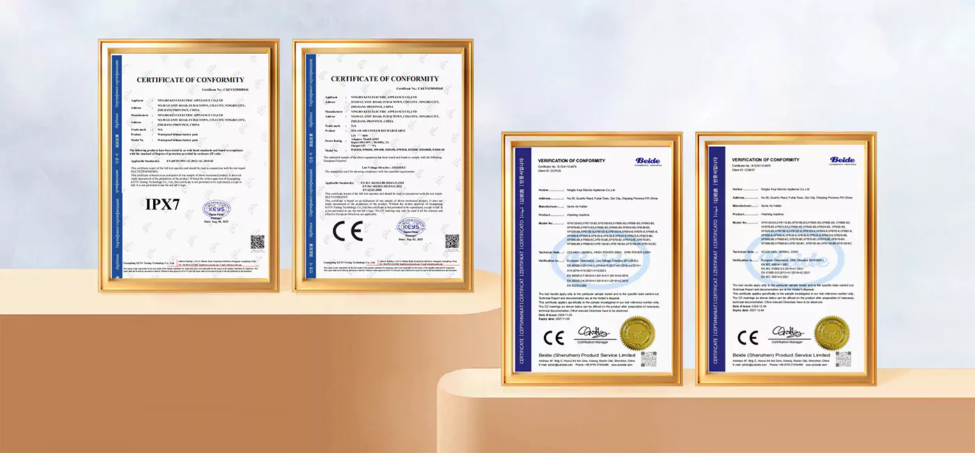 Τα πλυντήρια ρούχων και οι ψύκτες αέρα μας έχουν περάσει τα πρότυπα δοκιμών της ΕΕ και έχουν λάβει πιστοποίηση CE. Η μπαταρία διαθέτει αδιάβροχη βαθμολογία IPX7. Είμαστε επίσης πιστοποιημένοι ως εξαιρετικοί πωλητές σε εγχώριες πλατφόρμες ηλεκτρονικού εμπορίου και στην Alibaba.